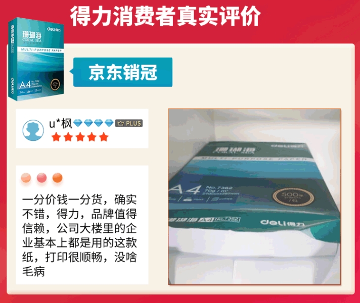 得力(deli)珊瑚海A4打印纸 70g克500张*5包一箱 销冠复印纸 双面草稿纸 整箱2500张 7361 自营